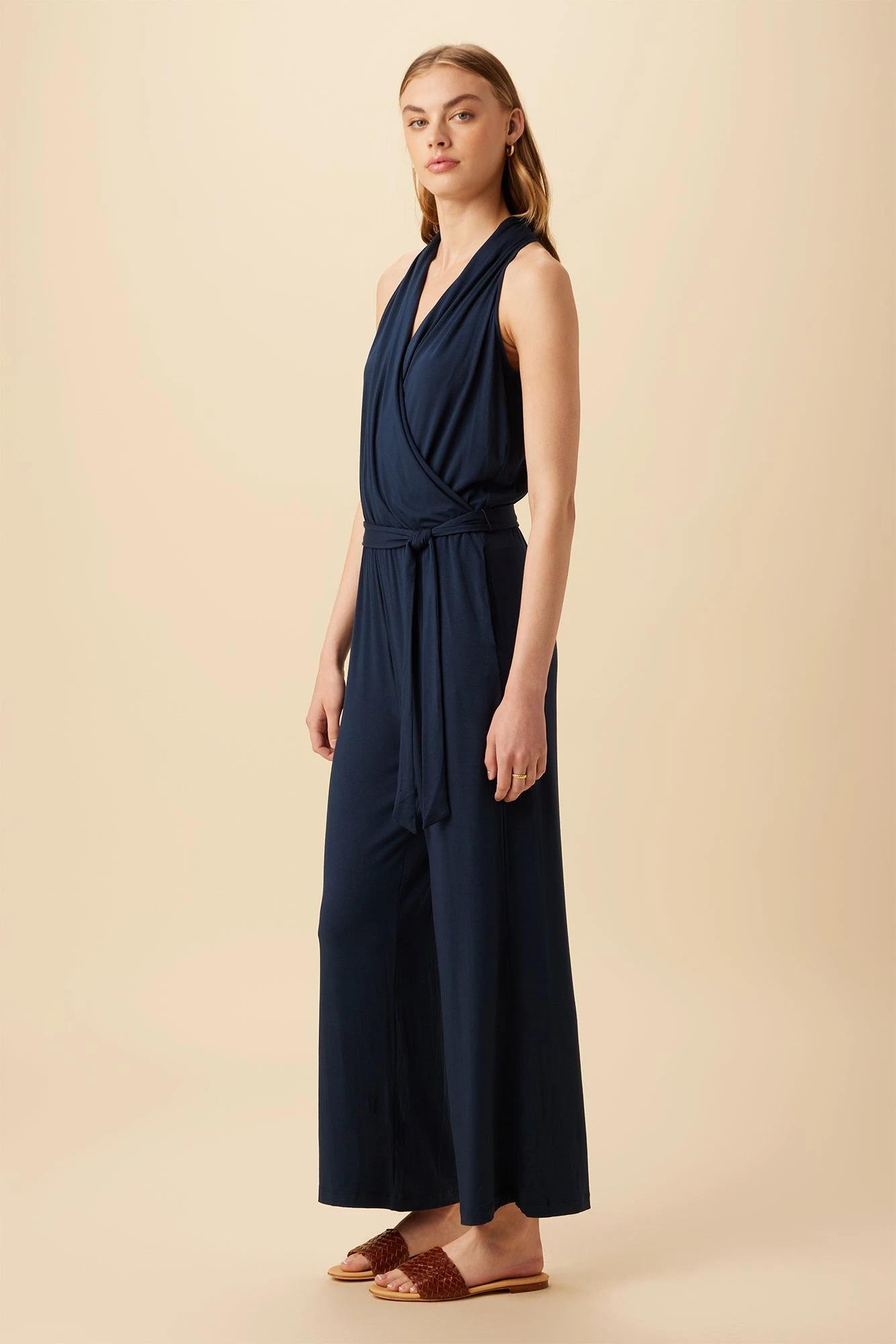 - This wide leg style features a wrap halter top, shirring at the sides, detachable waist tie, pockets and pulls on for ease.