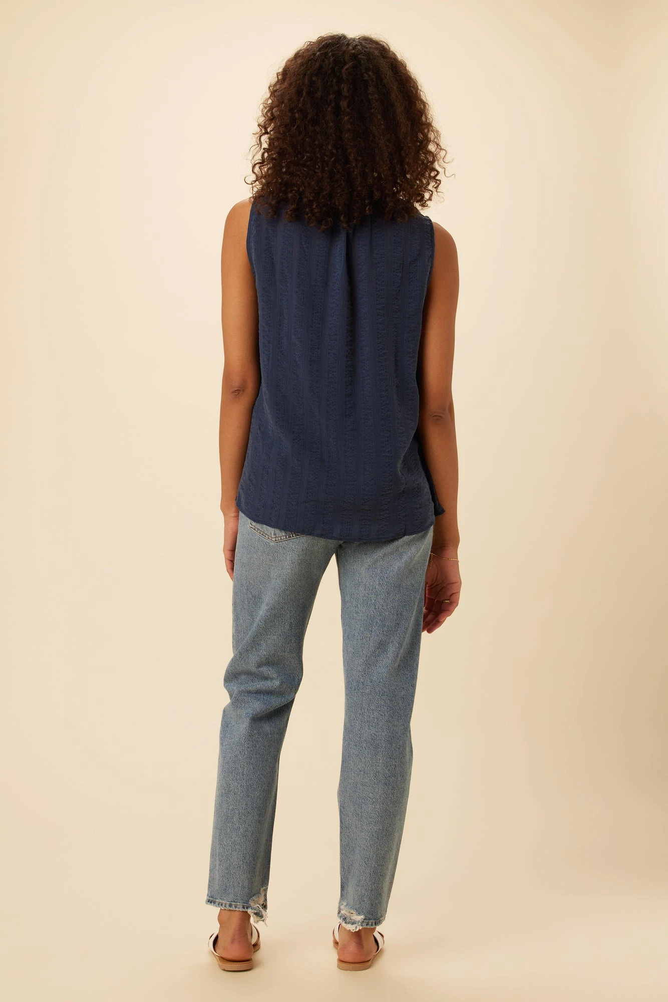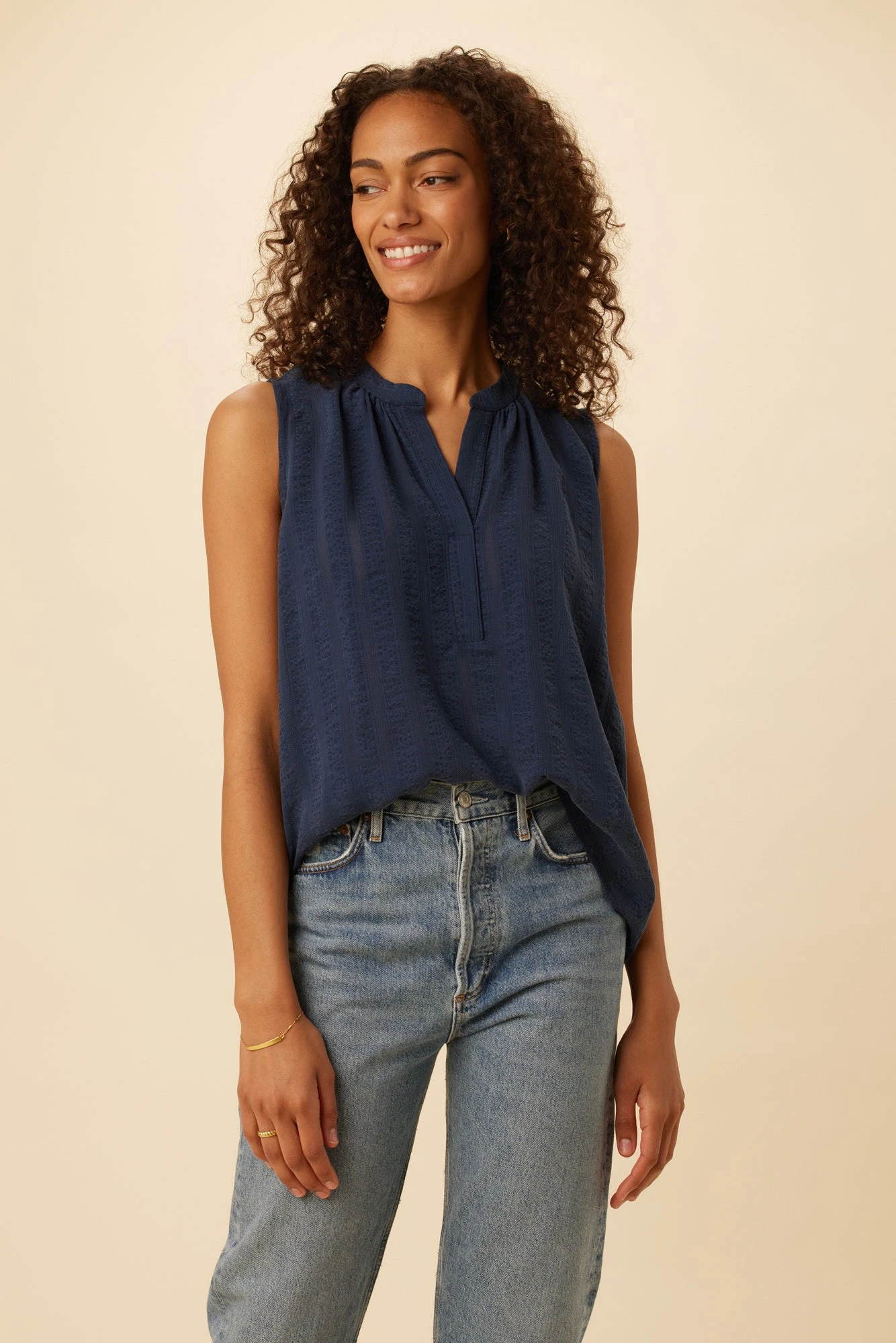 Relaxed fit, sleeveless high-low blouse with faux placket in the front. This versatile top is perfect paired with your favorite high-rise or mid-rise bottoms.