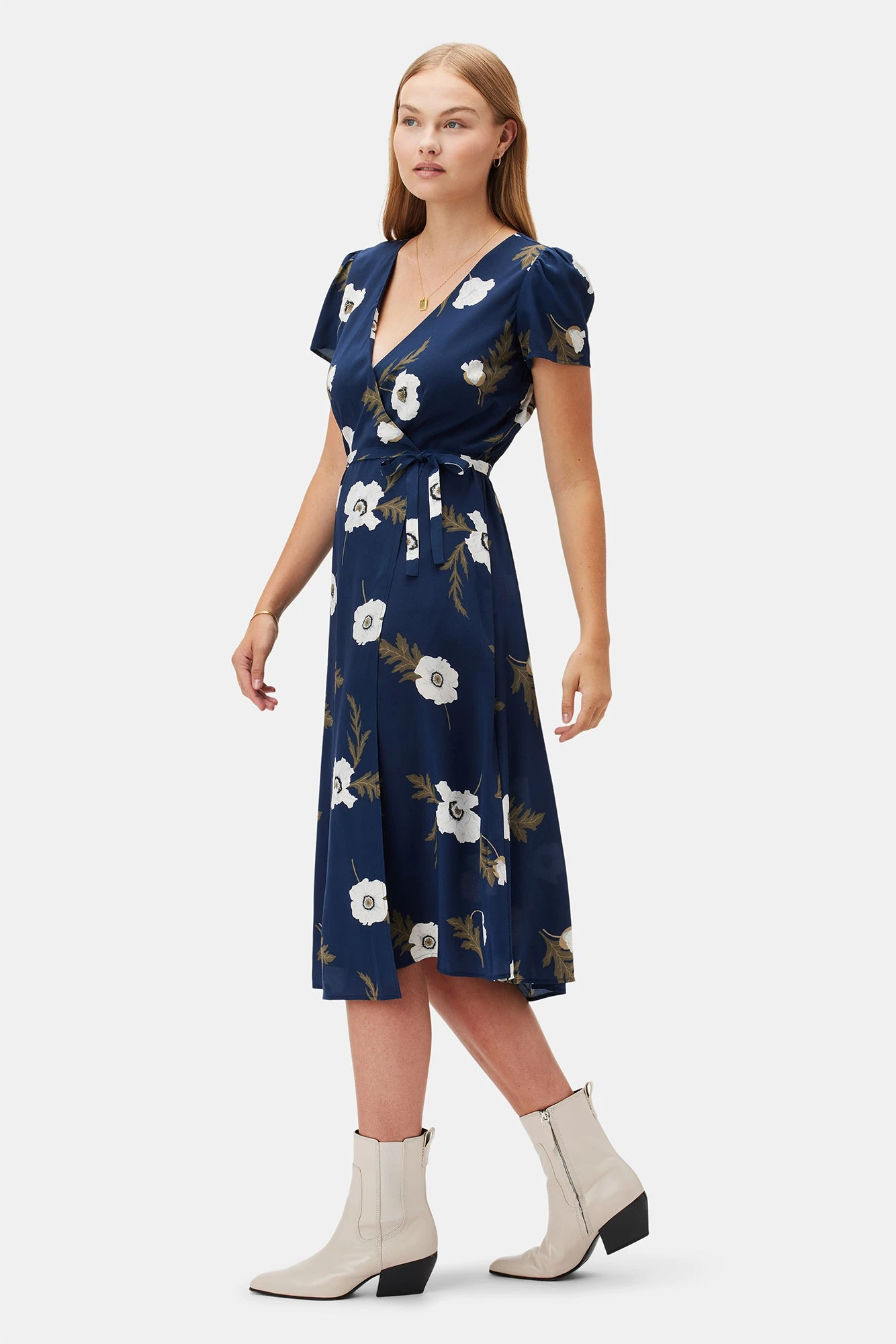 - This short sleeve wrap dress features an a-line silhouette, shirring at shoulder and yoke detailing.