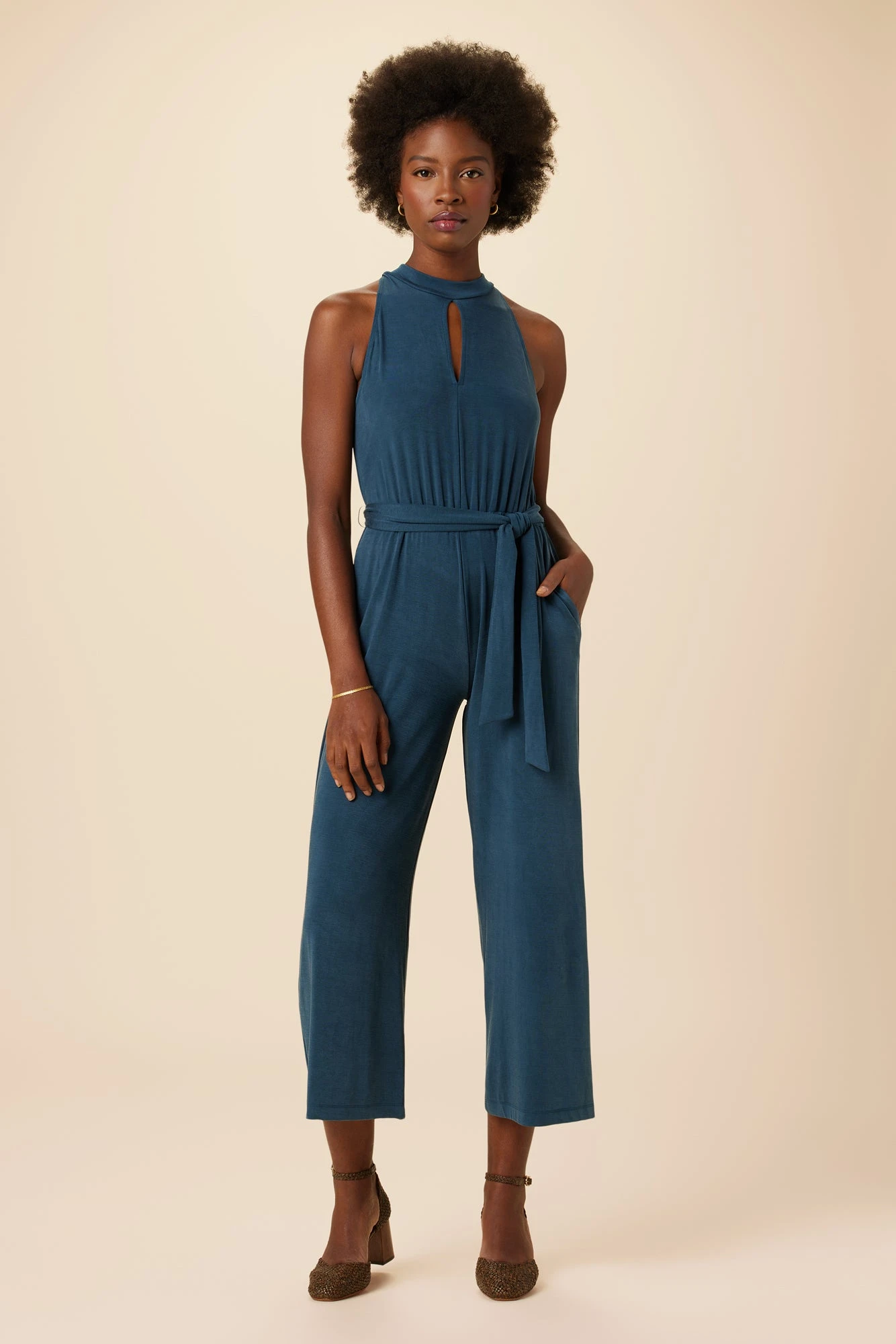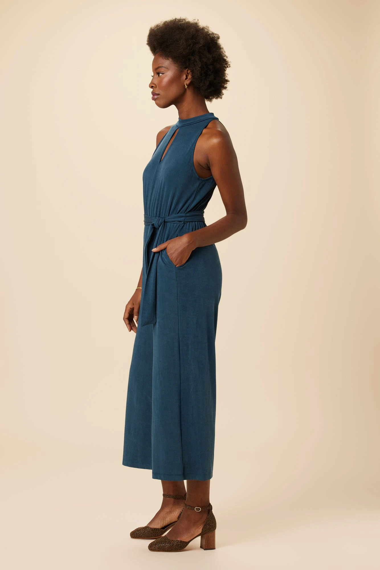 Slim fit, wide length jumpsuit made in our Tencel Luxe fabric, featuring a mock neck halter top, slit at front neck, elastic at waist and belt, and a loop and button at the neck for ease.