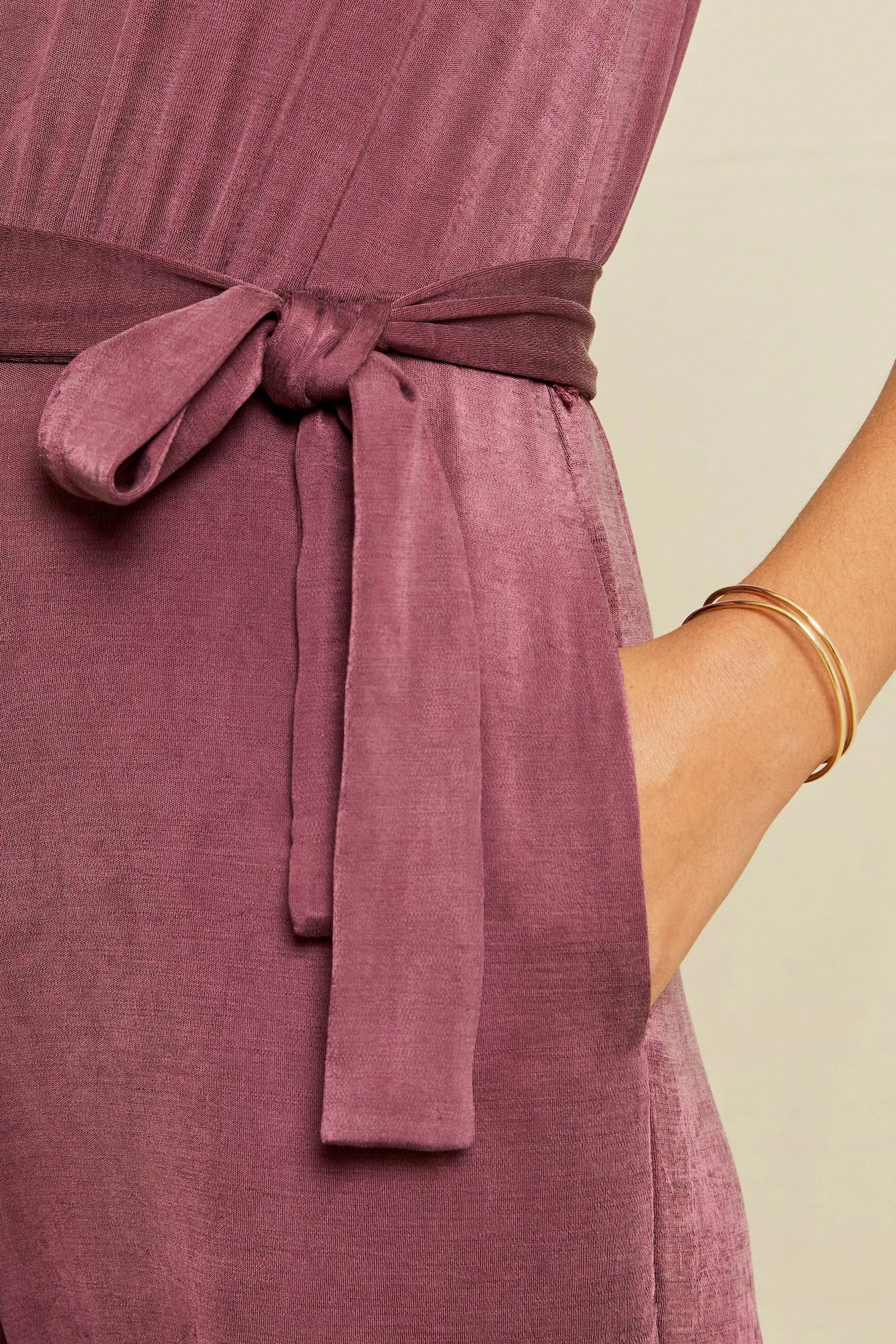 Slim fit, wide length jumpsuit made in our Tencel Luxe fabric, featuring a mock neck halter top, slit at front neck, elastic at waist and belt, and a loop and button at the neck for ease.