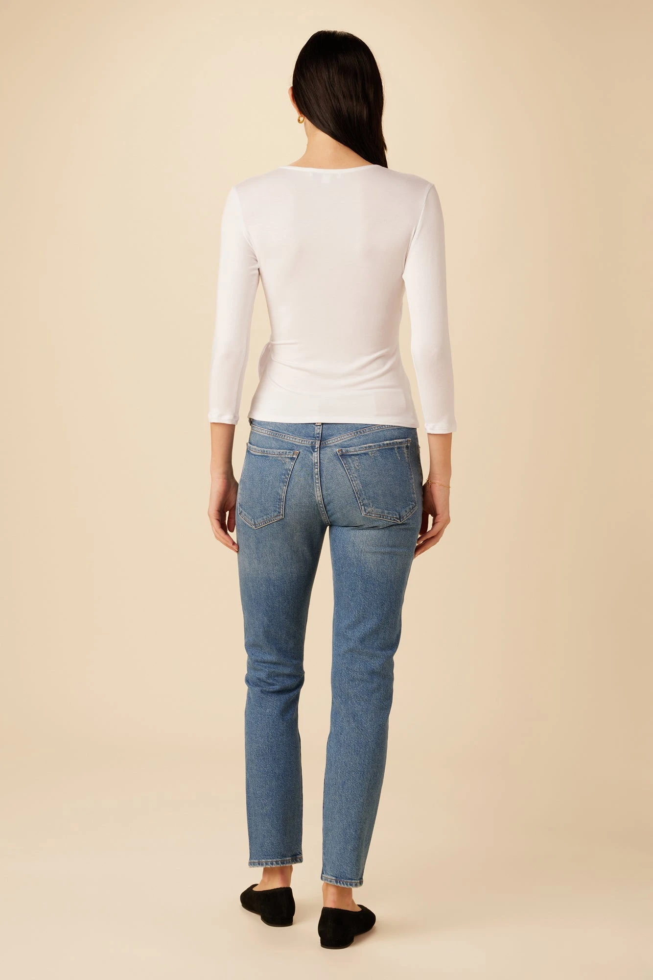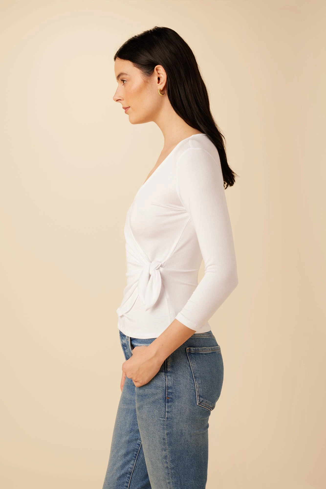 Made from sustainable TENCEL™ modal fiber that’s responsibly sourced from beechwood forests. This top features 3/4 sleeves, slim fitting half wrap top with adjustable ties at side.