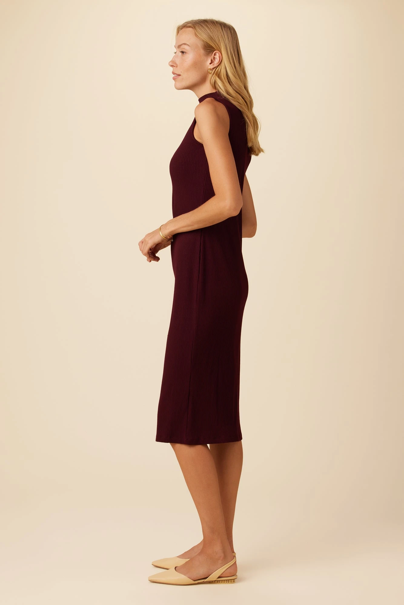 Sleeveless turtleneck dress with a clingy, bodycon fit. Made in our soft and perfectly stretchy Paris Rib, a sustainable blend of beechwood tree fibers.