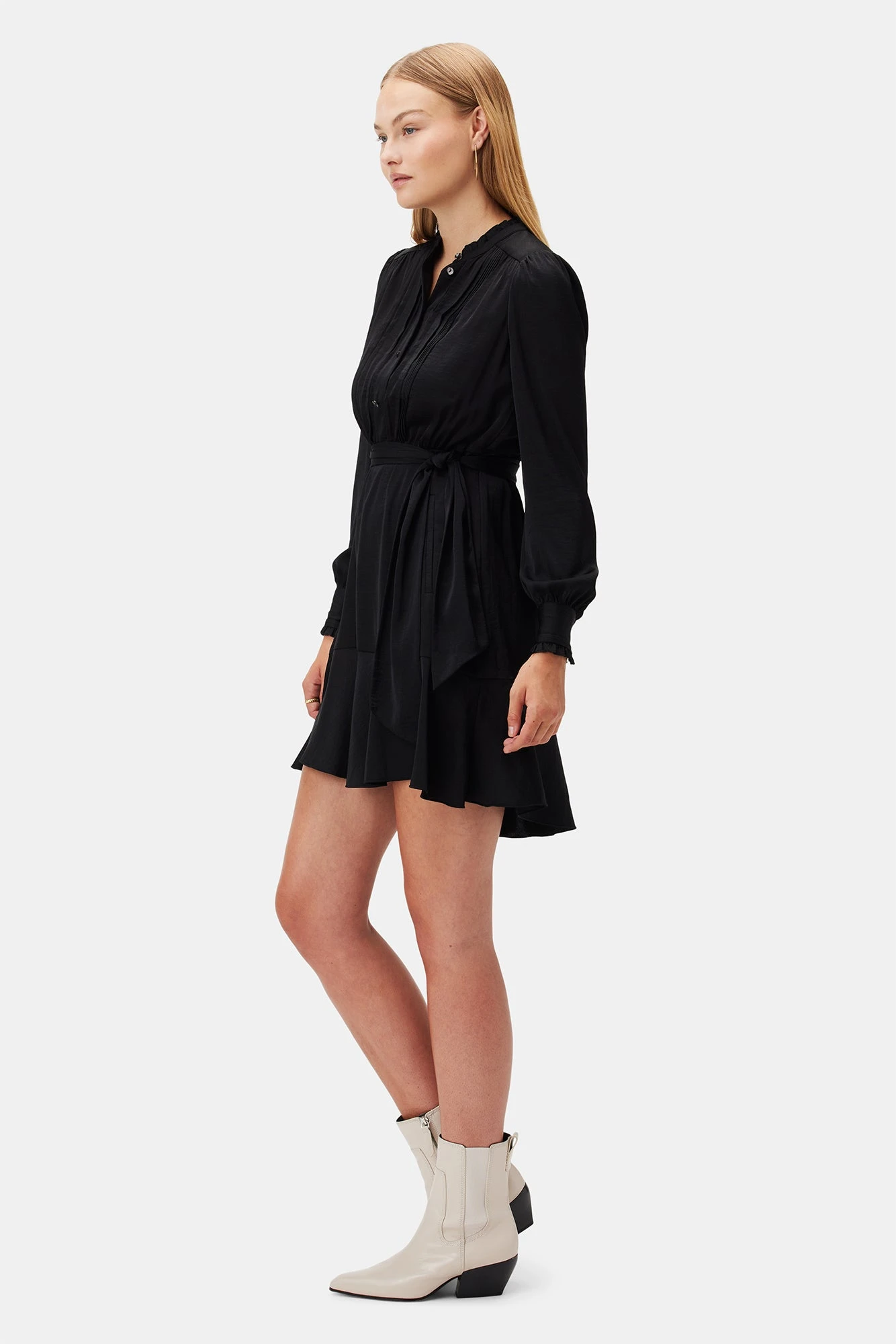 - This chic dress features long sleeves, a-line skirt that is lined, button front placket, inseam pockets and an detachable waist tie.