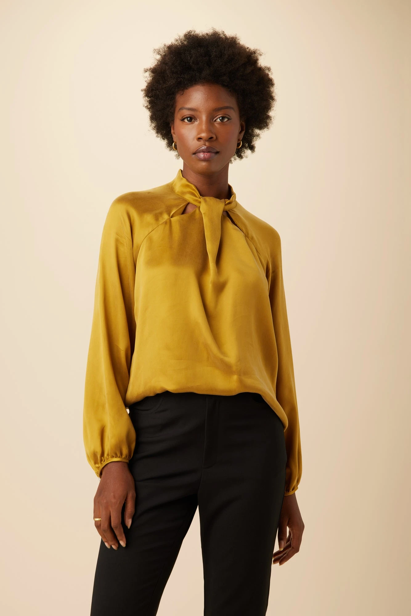 Blouse with long, voluminous sleeves, a fixed twist at the neck, and double button keyhole opening at the back neck. Made in our softest Cottonseed Cupro, a zero-waste fabric made from discarded cotton waste.