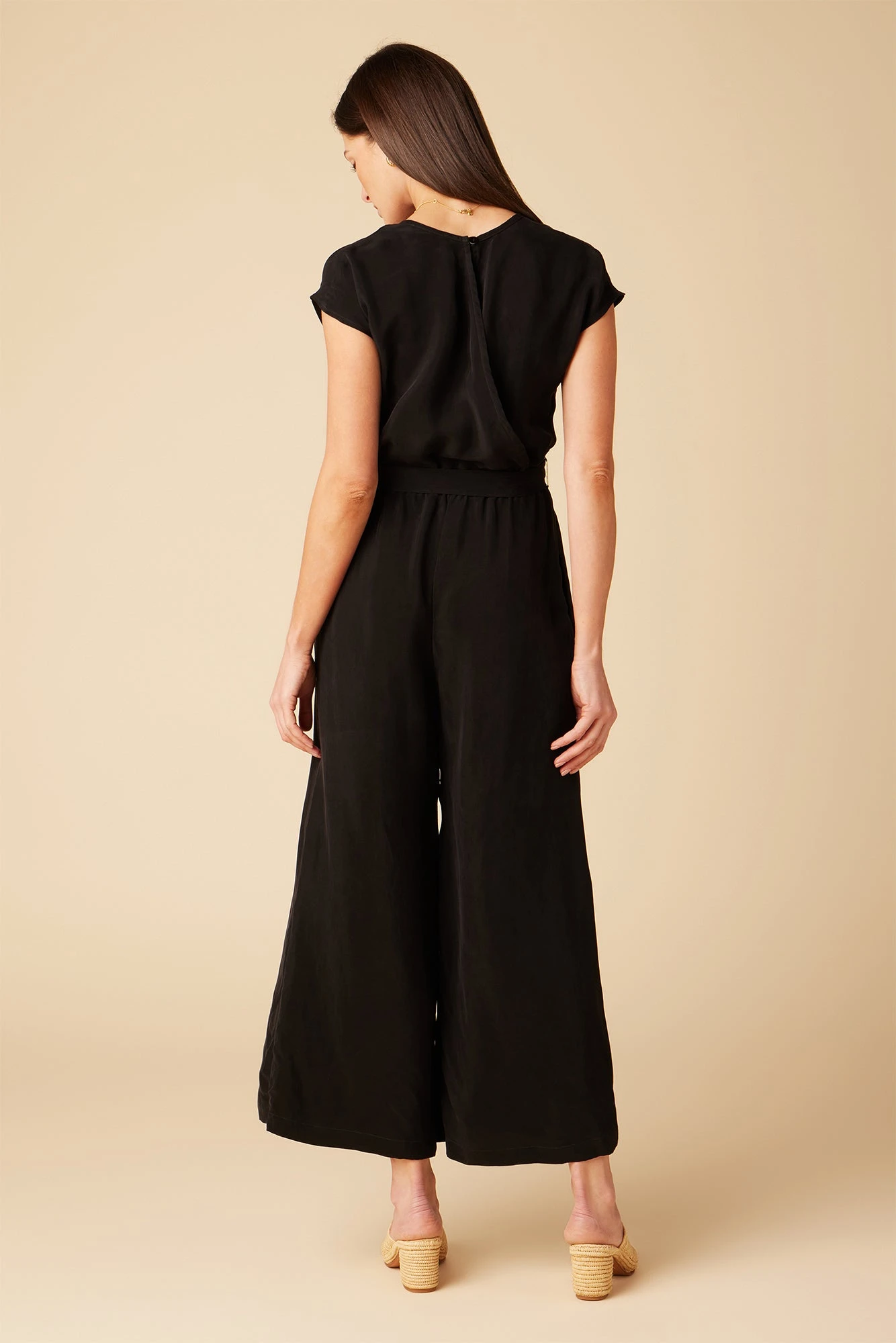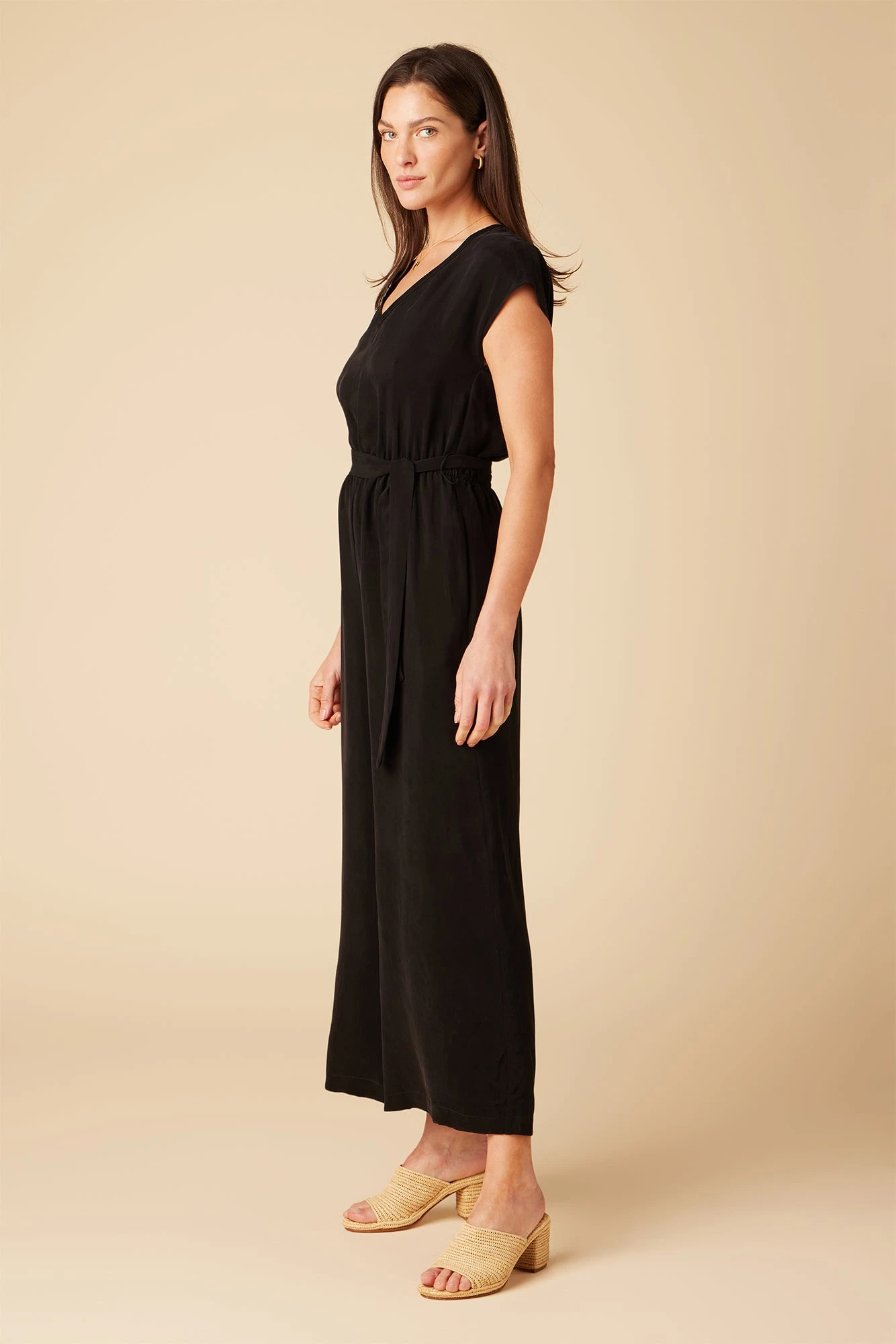 - V-neck jumpsuit with cap sleeve and elastic waist.